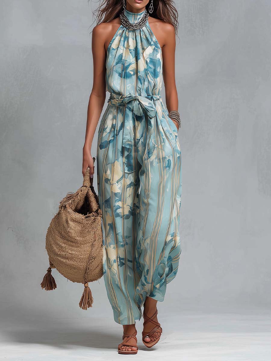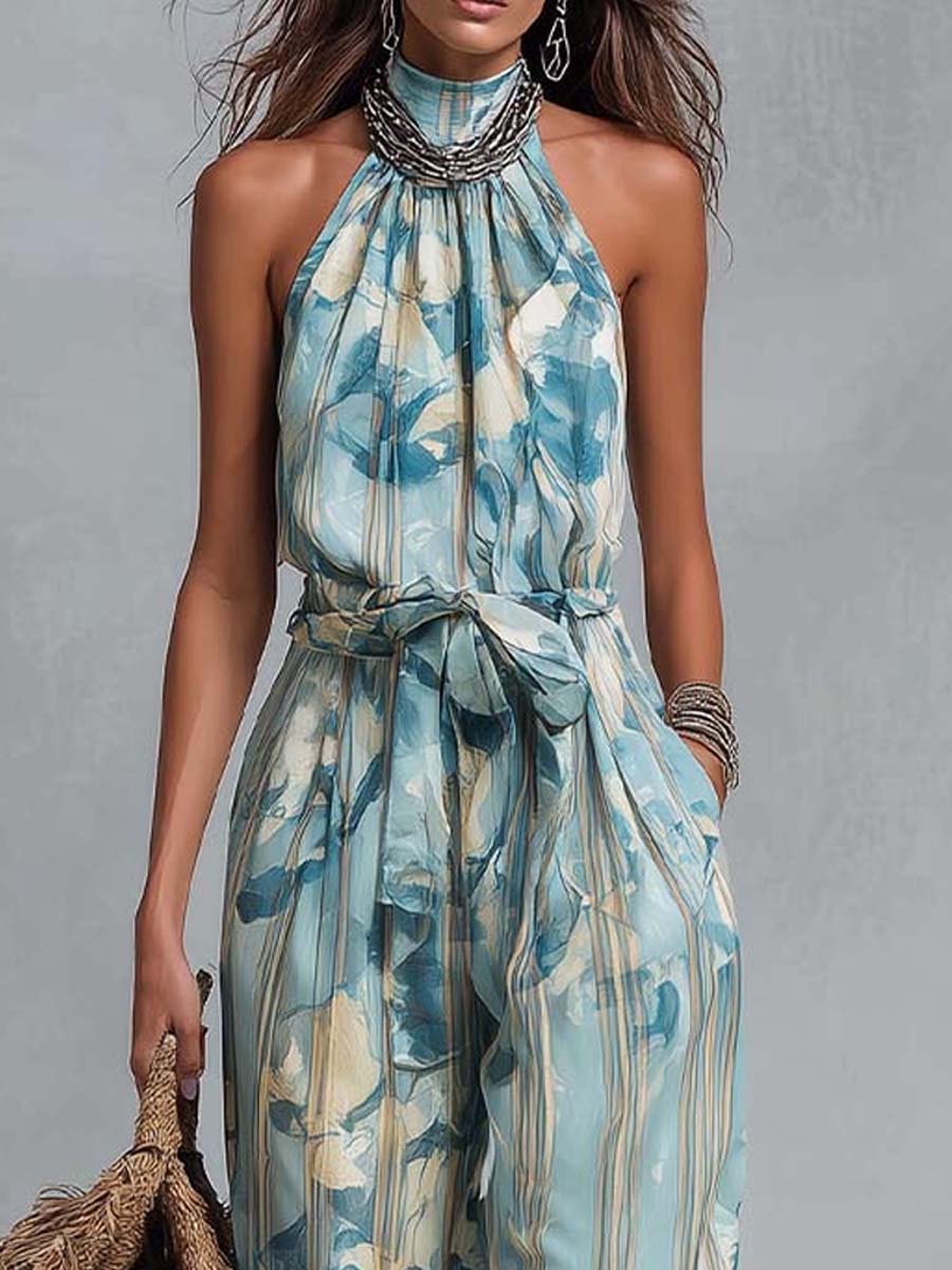 Bohemian Halter Floral Stripe Wide-Leg Jumpsuit With Waist Tie