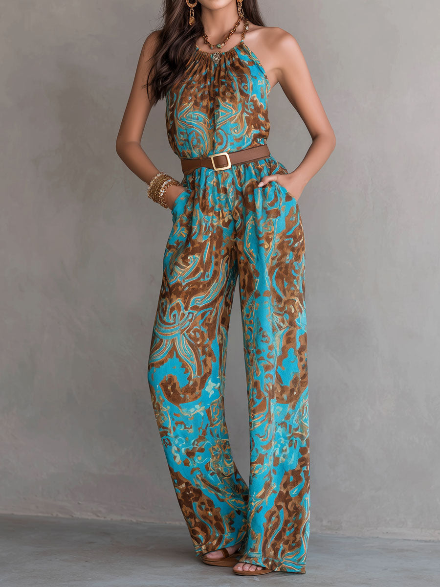 Bohemian Halter High-Neck Wide-Leg Jumpsuit