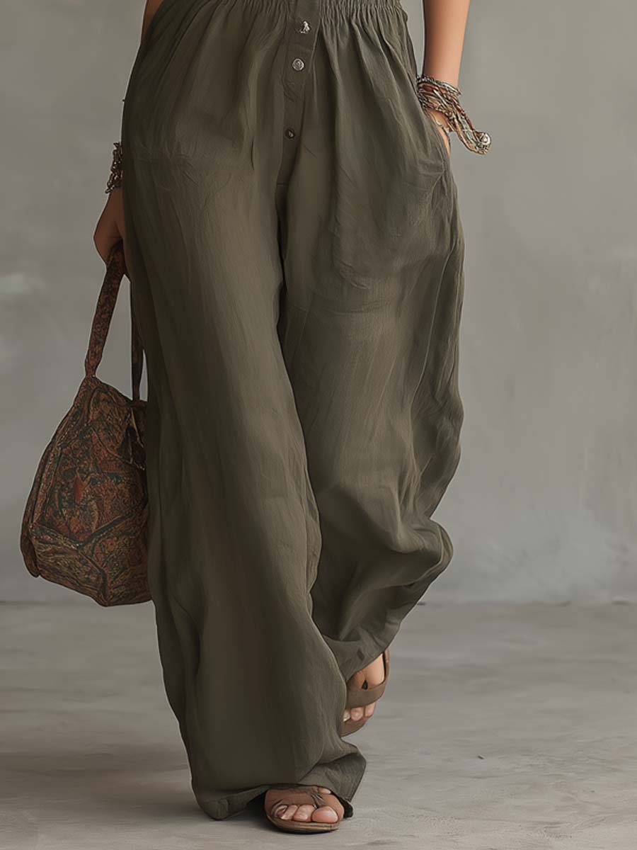 Bohemian Cotton-Linen Halter Smocked Wide-Leg Jumpsuit