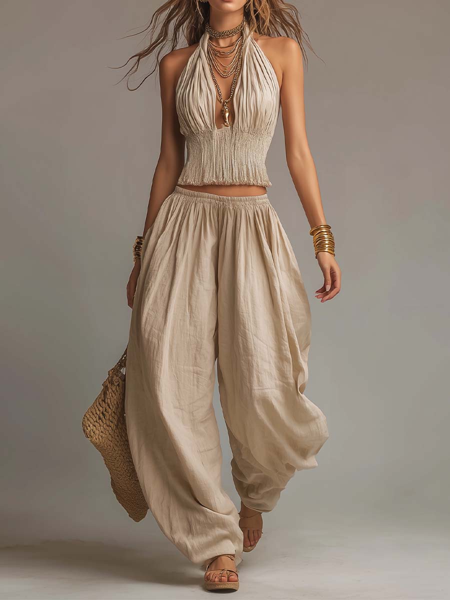 Bohemian Cotton-Linen Halter Smocked Crop Top & Harem Pants Two-Piece Set
