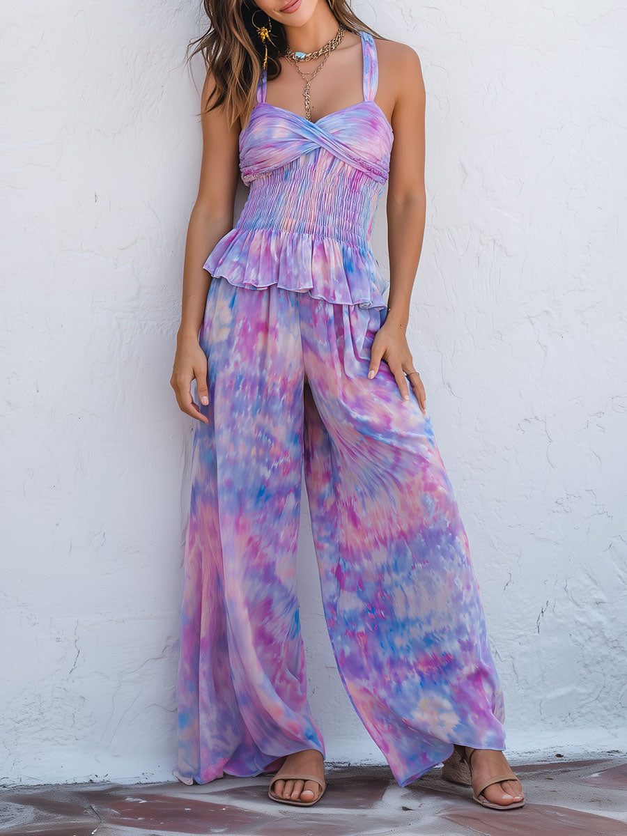 Boho Pastel Tie-Dye Smocked Halter Top & Wide-Leg Pants Set
