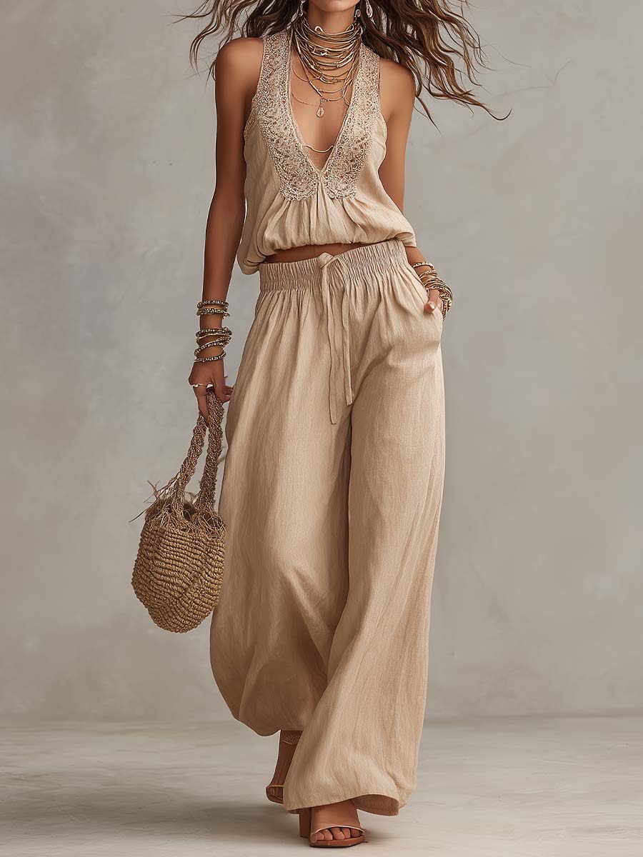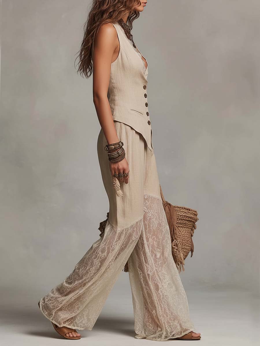 Bohemian Cotton-Linen Vest & Lace Wide-Leg Pants Two-Piece Set