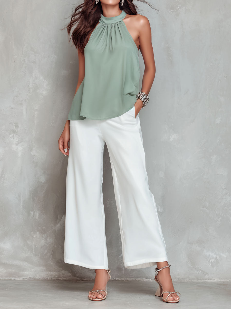 Chic Sage Green Halter Neck Blouse & White Wide-Leg Pants Set