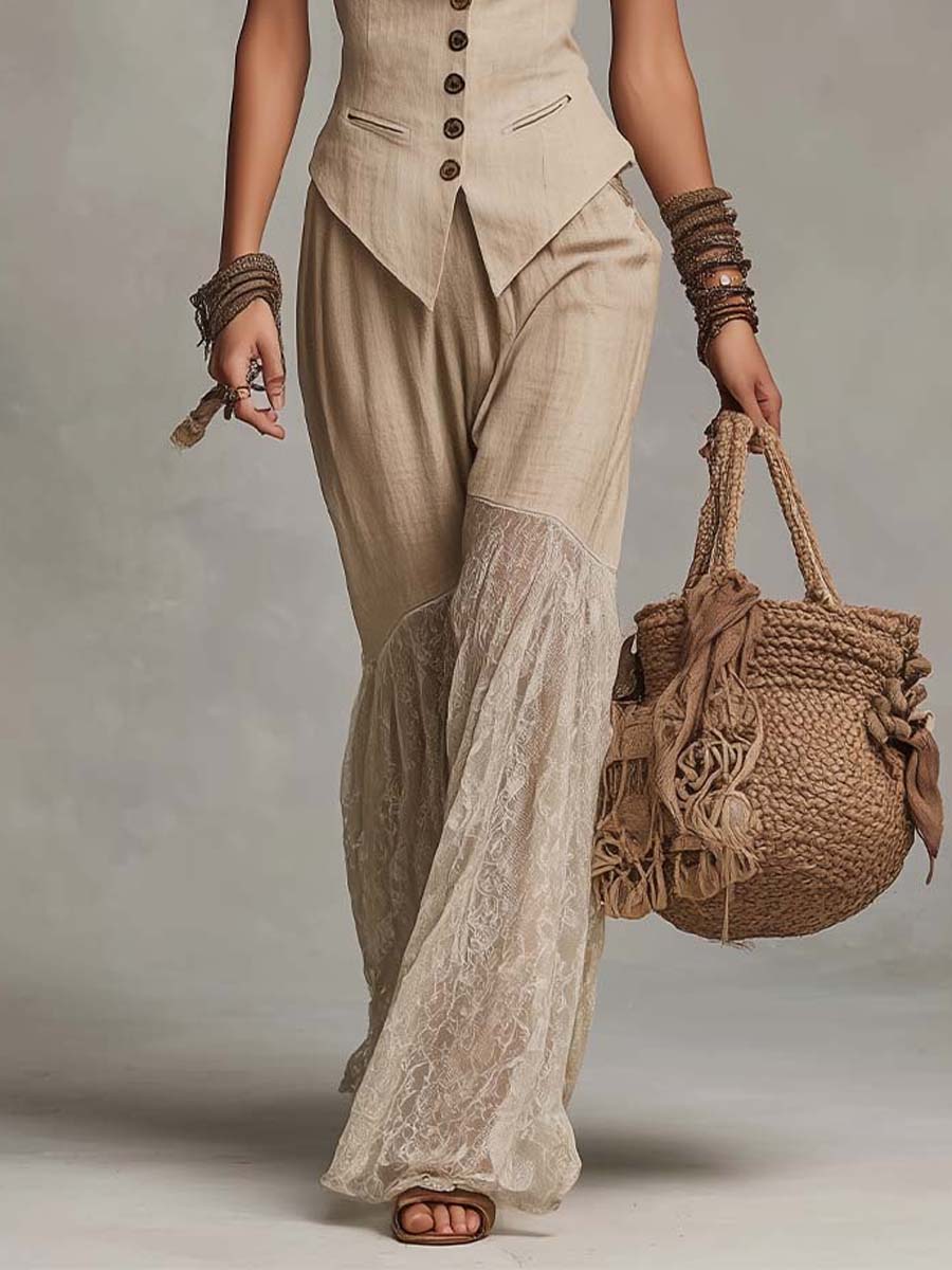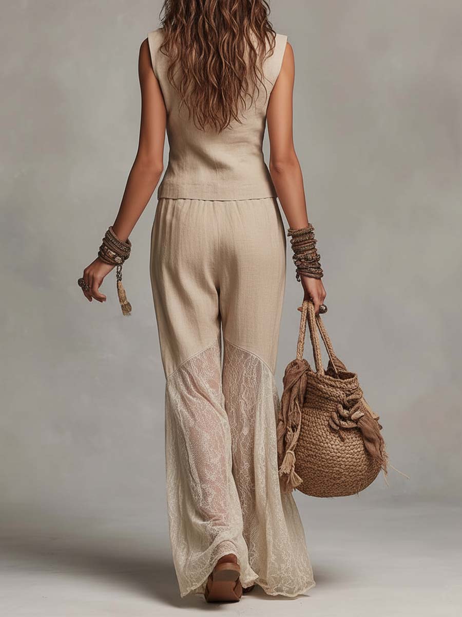 This bohemian two-piece set is crafted from lightweight, breathable cotton-linen blend fabric in a warm beige hue, designed for effortless warm-weather elegance. The sleeveless vest features a deep V-neck trimmed with delicate lace, a button-front closure, and a tailored fit with a pointed hem that accentuates the waist. The matching wide-leg pants combine textured linen with intricate lace paneling along the lower legs, creating a flowy, romantic silhouette that moves gracefully with every step.