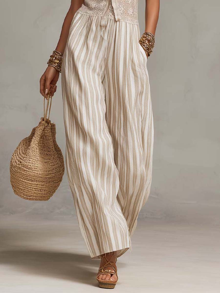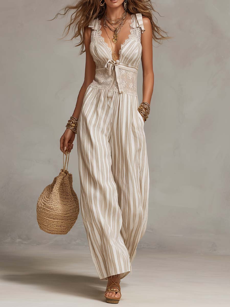 This bohemian wide-leg jumpsuit features a classic vertical stripe pattern in warm beige and white, crafted from lightweight woven fabric for effortless warm-weather style. The deep V-neck bodice is adorned with delicate lace trim and ruffled shoulder straps, while a double-layered lace overlay at the waist creates a romantic peplum effect, accentuating the figure with a front tie sash. The high-waisted, flowy wide-leg pants include functional side pockets, creating a polished yet free-spirited look.