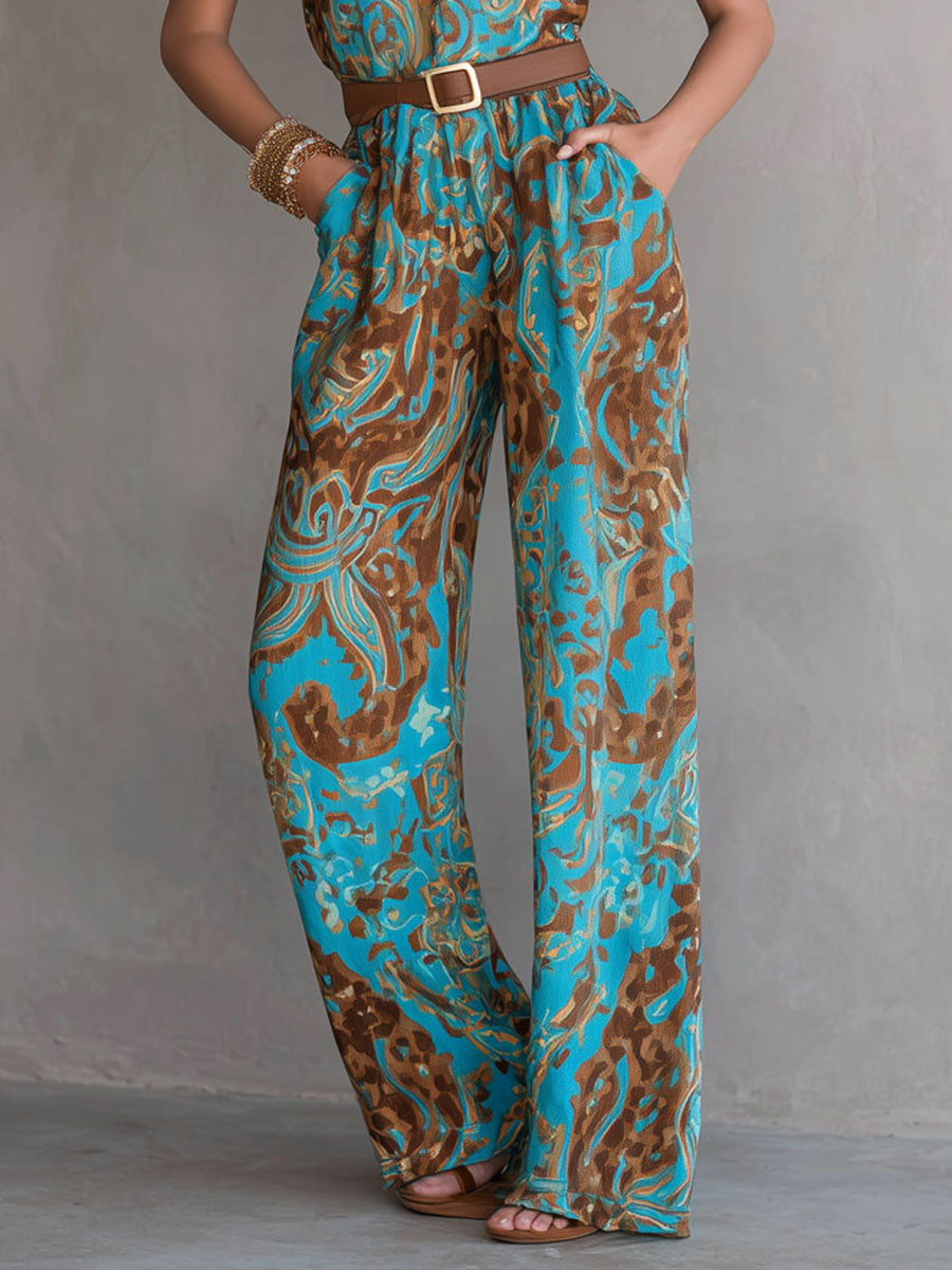This boho-inspired halter neck jumpsuit features a vibrant teal and warm earth-tone print across a flowing, wide-leg silhouette. Sleeveless and airy, the piece is designed for comfortable all-day wear while maintaining a relaxed, flattering shape. The halter neckline draws attention to the shoulders and collarbone, making it an effortless statement piece for warm-weather occasions.