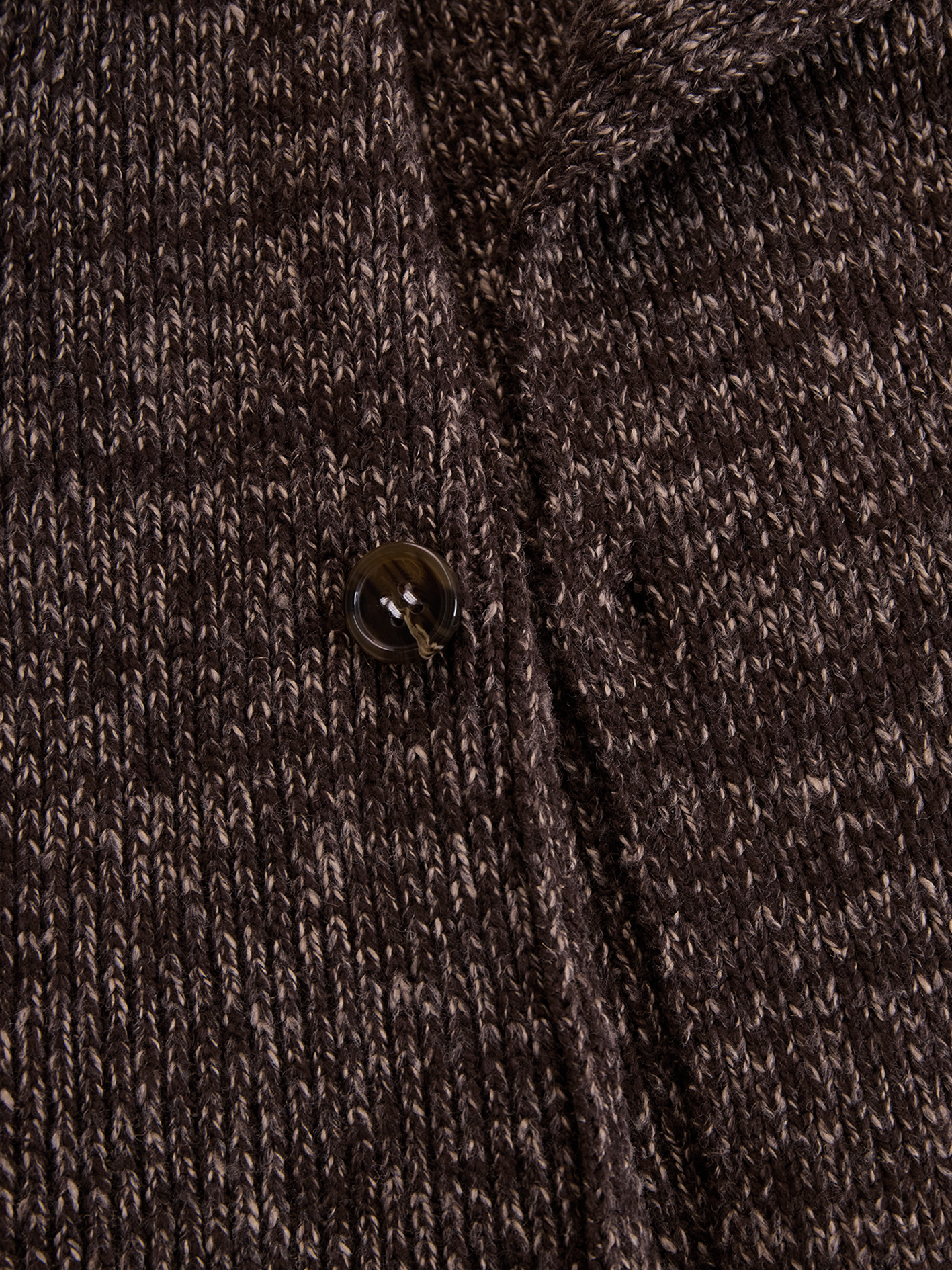 A sleek, fitted knit jacket designed with an asymmetrical front zipper and structured silhouette. The ribbed texture adds depth and dimension, while the rich brown hue offers a timeless and versatile appeal. Featuring a high collar and long sleeves with extended cuffs, this jacket blends casual comfort with edgy sophistication.