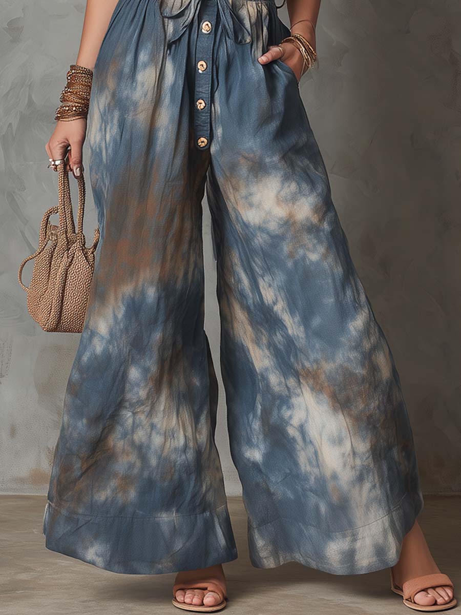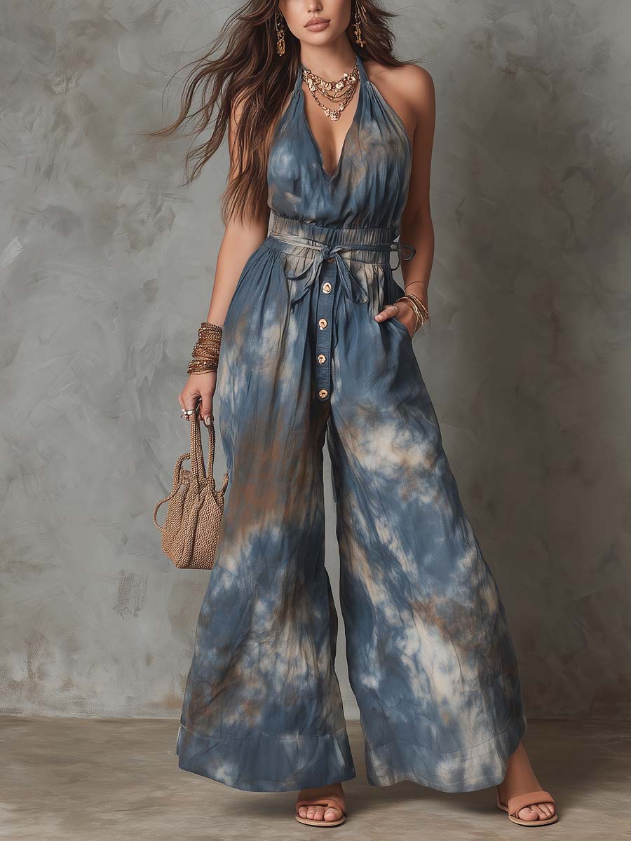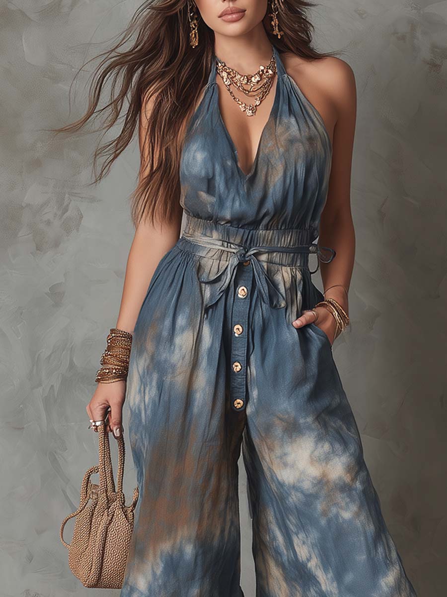 Retro Tie-Dye Printed Halter Jumpsuit